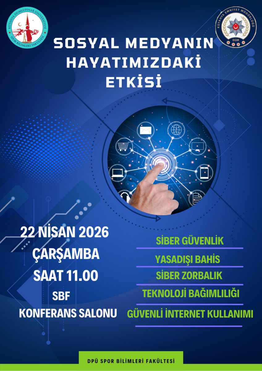 Kütahya Dumlupınar Üniversitesi Spor Bilimleri Fakültesi tarafından düzenlenen “Sosyal Medyanın Hayatımızdaki Etkisi” konulu konferansa tüm öğrencilerimiz ve ilgililer davetlidir.