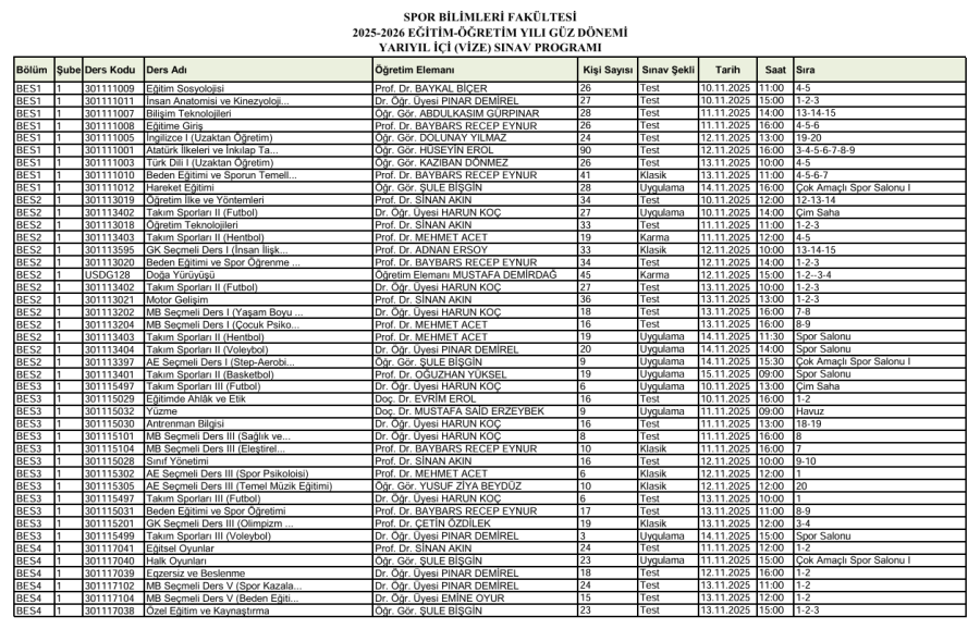 2025-2026 Eğitim - Öğretim Yılı Güz Dönemi Vize Sınav Programı